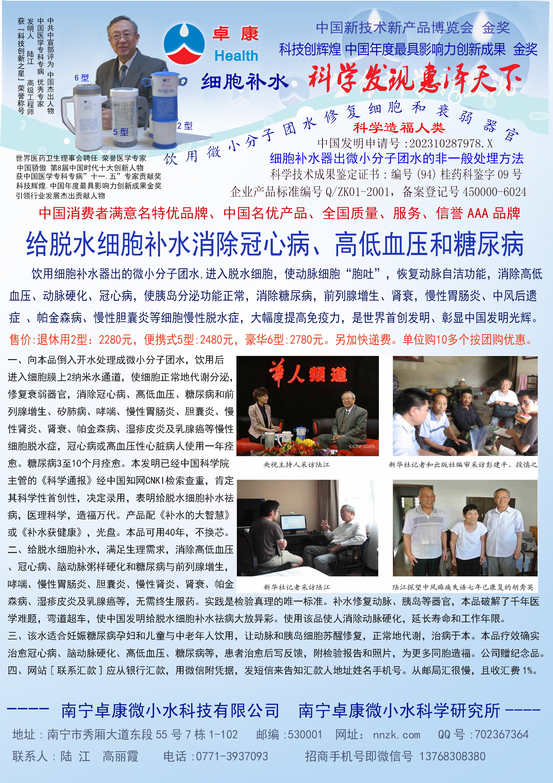 -----我是從事建筑的高工,本來沒有資格去攻克醫(yī)學難題,卻為了自身健康才扣響醫(yī)學的大門。由于我1990年患高血壓,因怕中風才研究發(fā)明了離子水瓶,我把水處理成微小分子團水,飲用后治愈了高血壓。便于1993年底送到三家省級醫(yī)院做臨床試用4個月。經(jīng)北京和廣西醫(yī)學專家鑒定:"降脂降壓效果好"," 能擴大心腦動脈流量,改善心腦電圖以及微循環(huán)","對治療心腦動脈粥樣硬化、高血壓、高血脂有良好的醫(yī)療保健作用。""產(chǎn)品的技術性能和療效達到了同類產(chǎn)品的國內領先水平,經(jīng)廣西醫(yī)學科學情報研究所檢索,未見國外有類似報道。"中國醫(yī)學科學院張正國教授從美國國立醫(yī)學圖書館數(shù)據(jù)庫存Medline檢索英俄文資料,均未見類似報告。2000年上市后,我為了對消費者負責而繼續(xù)觀察研究,一直通過《信譽卡》和《質量跟蹤調查書》向患者承諾療效,請用戶使用6個月后反饋效果。和脂壓患者飲用2至5個月內,消除癥狀,停服藥物,血壓正常;冠心病患者飲用3~5個月逐漸減輕至消除心絞痛、房顫等癥狀,不再服藥,飲用1年左右心電圖正常,經(jīng)冠脈造影掃描無明顯狹窄,表明冠心病痊愈。大量患者還反映許多衰弱器官被修復,讓前列腺增生、慢性咽喉炎、慢性氣管炎、支氣管炎、慢性胃炎、腸炎和膽囊炎等不藥而愈;2型糖尿病患者是因為胰島衰弱致病,飲用該水半年至一年,逐漸減藥至停藥,血糖尿糖正常,真正治愈2型糖尿病。中風后遺癥患者飲用六七個月,可逐漸減輕至消除肢體和語言障礙,表明飲用該水能讓壽命很長的神經(jīng)元細胞逐漸修復,奇跡般地恢復肢體和語言功能。飲用后還使胸腺和脾臟兩個重要的免疫器官被修復和增強,產(chǎn)生免疫細胞多,提高了免疫力,使人不生病或少生病。自此, 飲用微小分子團水創(chuàng)造了攻克冠心病、高(低)血壓和糖尿病三大醫(yī)學難題的奇跡。人們對此感到不可思議,但實踐是檢驗真理的唯一標準。